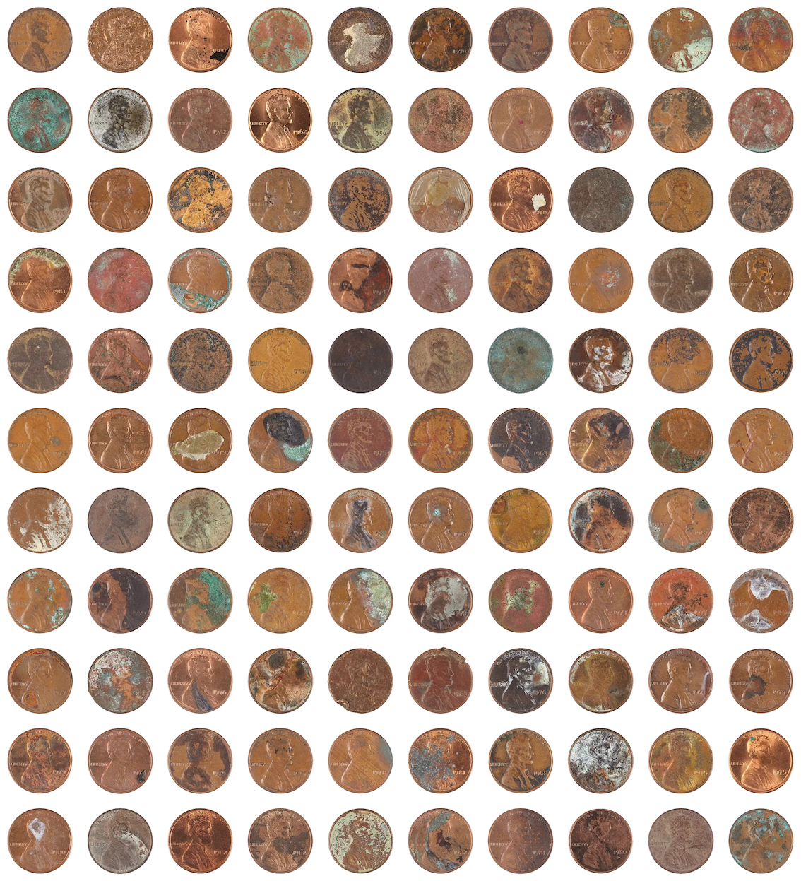 《美分》(2017–2024)将一万枚旧美分硬币熔铸为铜立方体,同时将其数字影像铭刻于区块链之上,物质的重量与数字的永续在此交叠,价值不再单一指向经济,而被拉入时间与技术的双重维度。